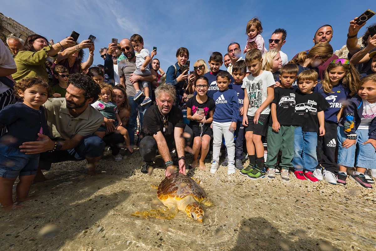 Le tartarughe portate sul bagnasciuga di Cala Paguro (Cala Paura) dove i bimbi hanno potuto vederle da vicino e ascoltato le spiegazioni. Dopodiché sono state caricate su imbarcazioni e portate a largo per liberarle direttamente in mare aperto ed evitare quindi che possano andarsi ad incagliare in reti fantasma.