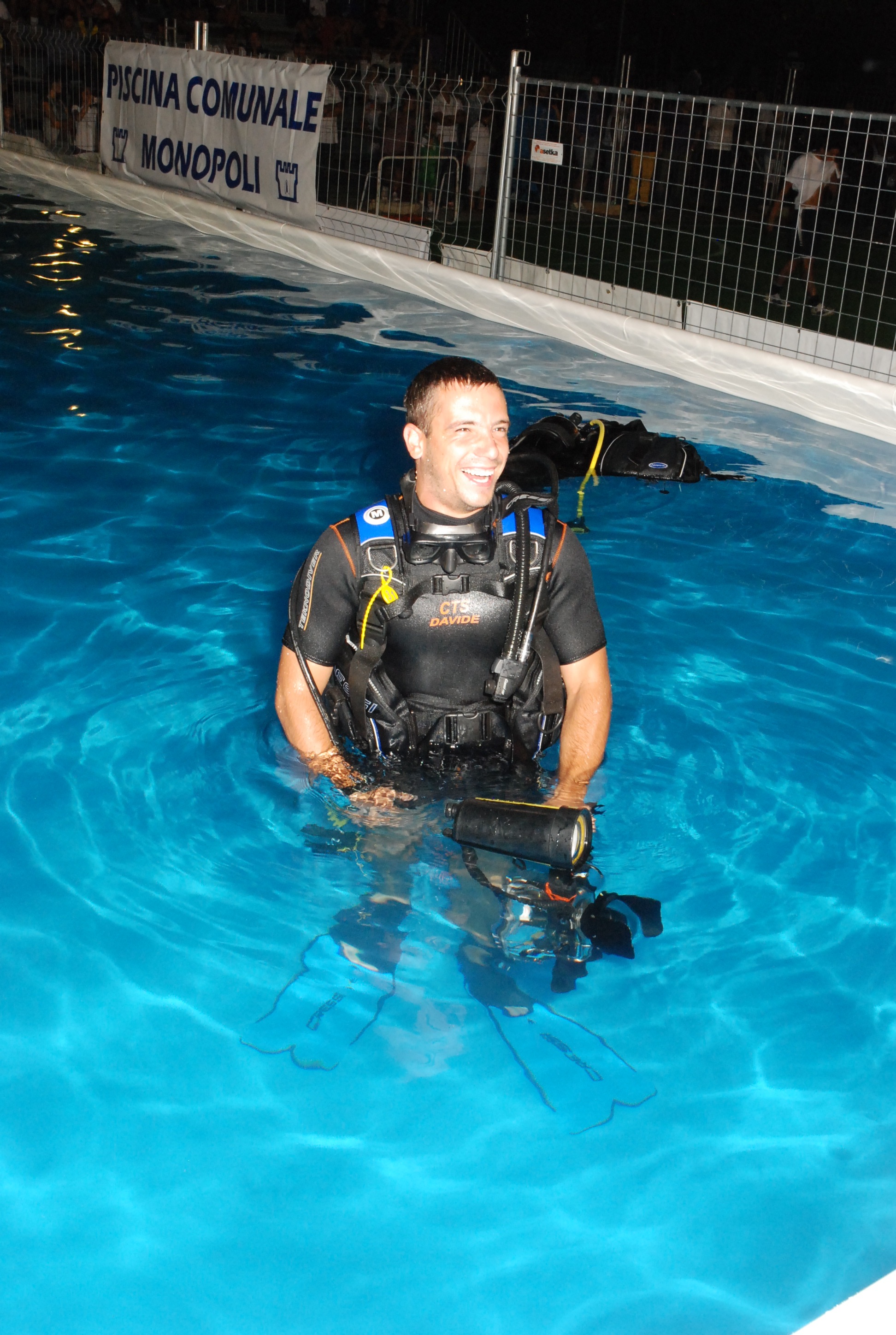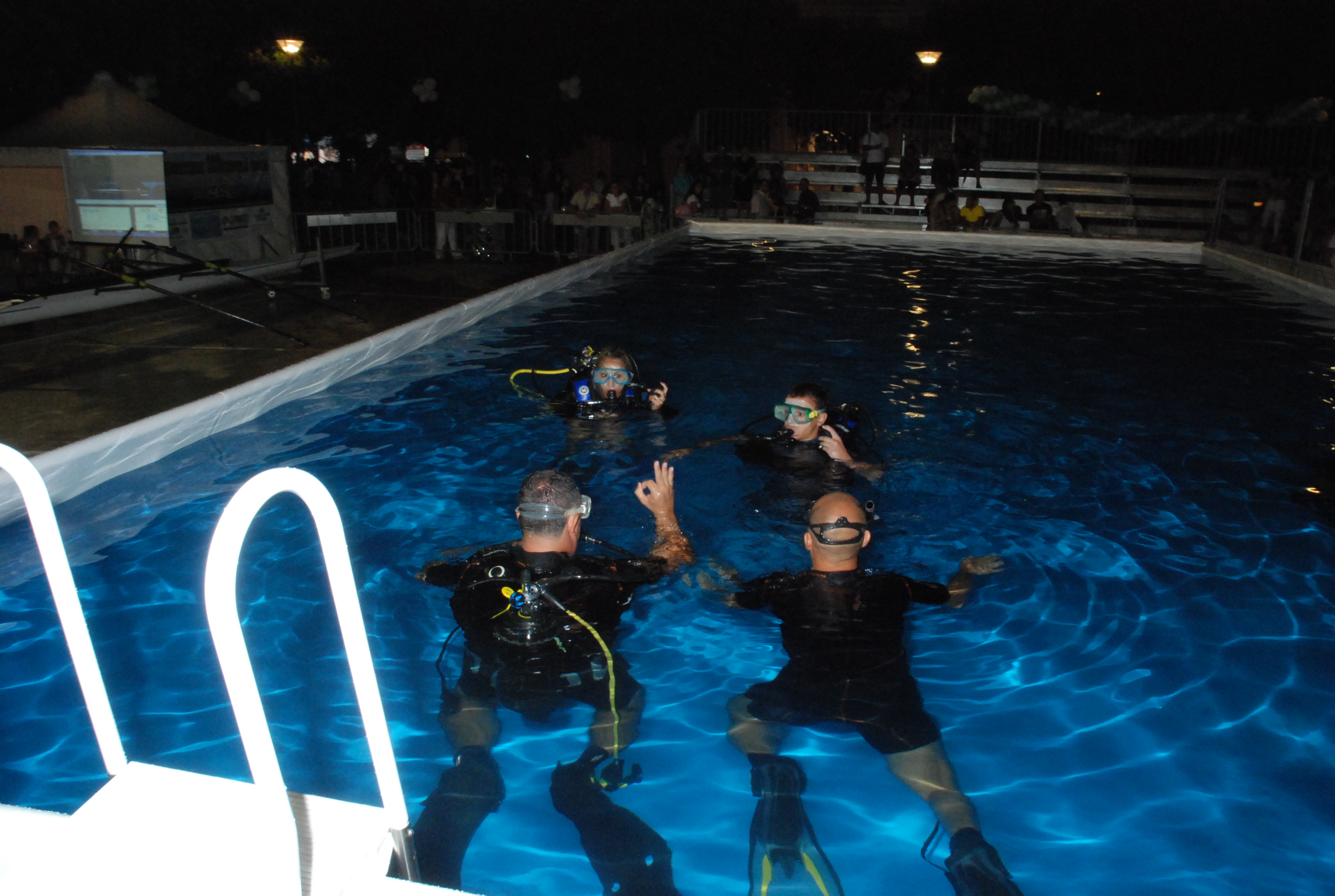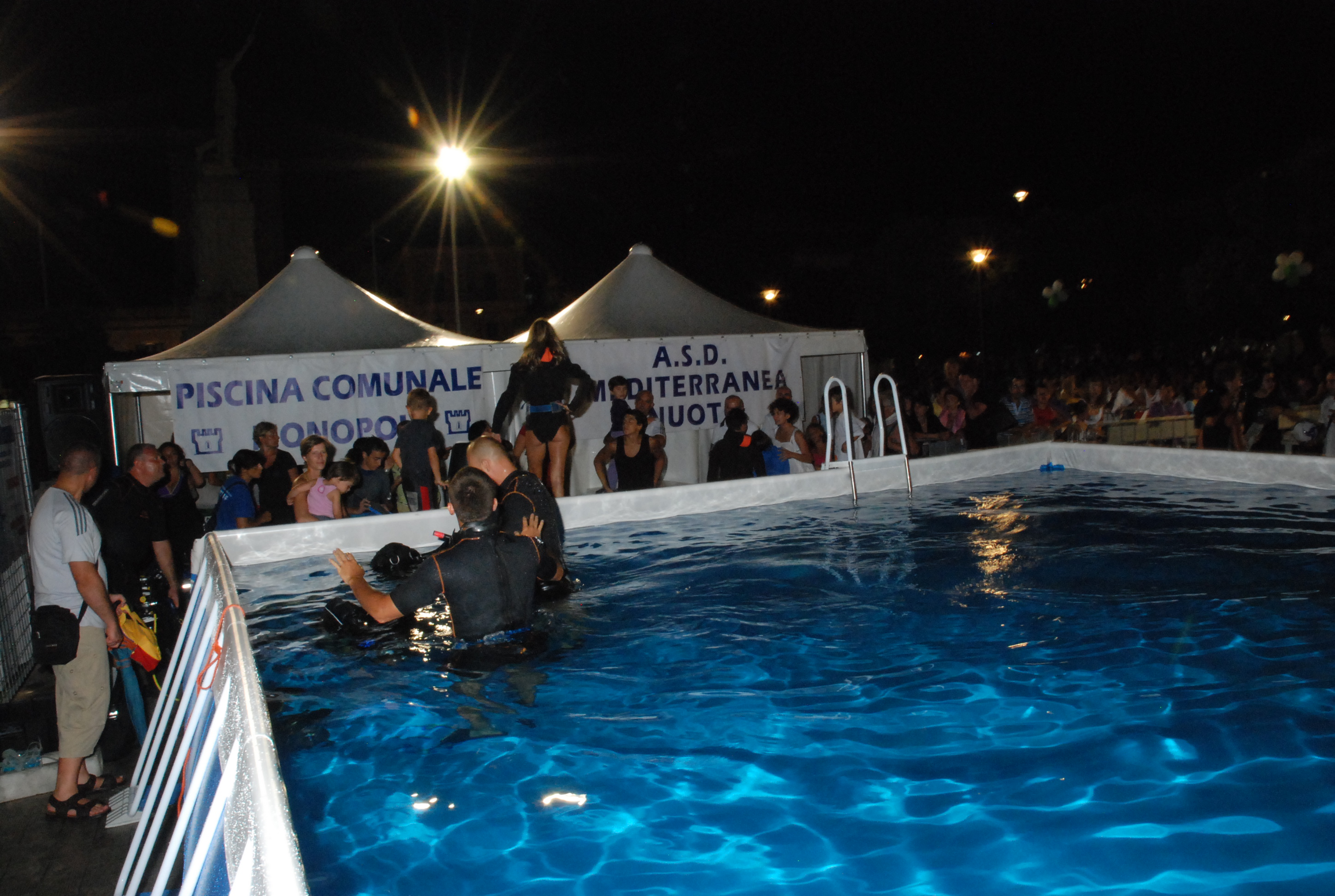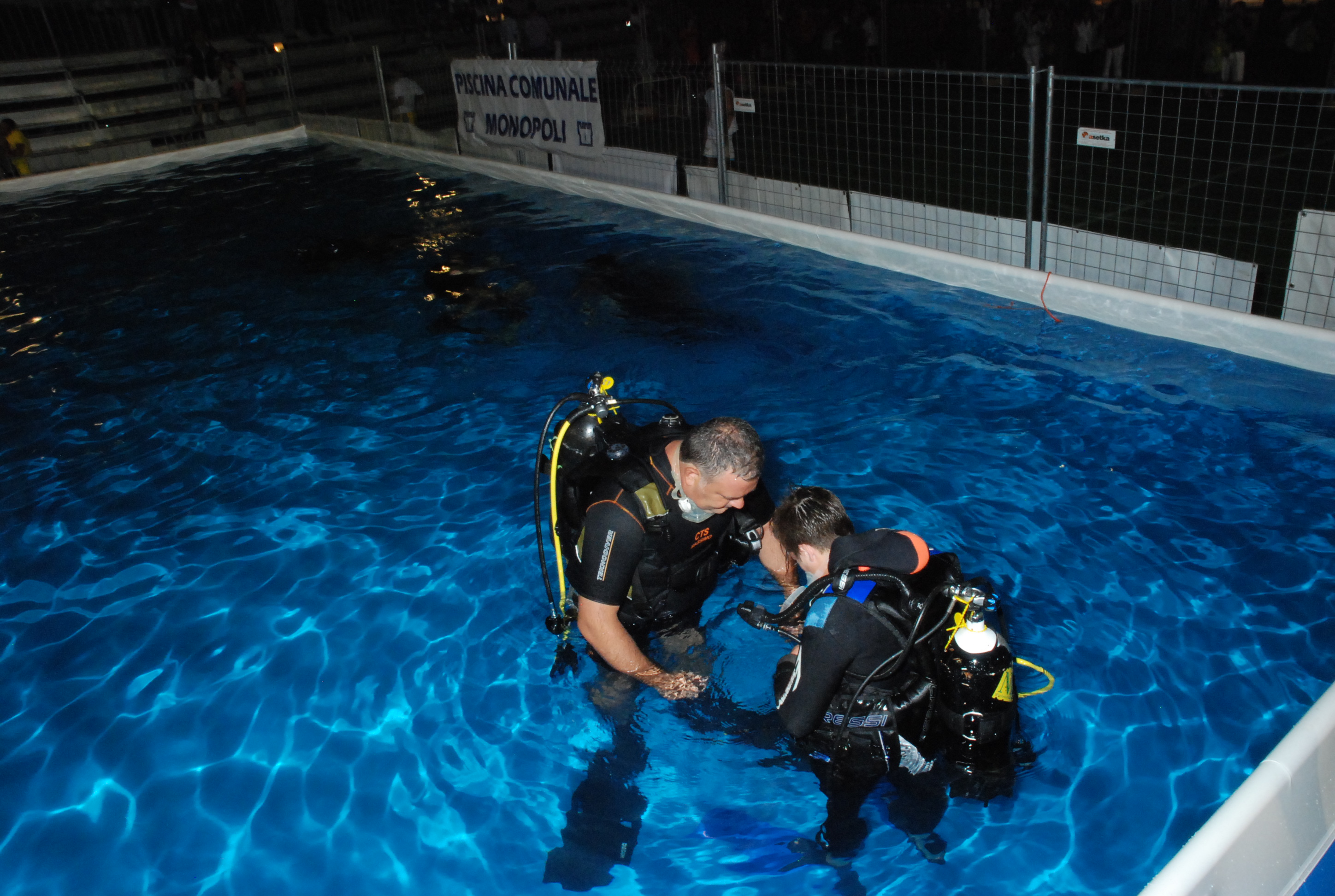 Nel nostro specifico caso, in collaborazione con la Piscna Comunale di Monopoli e a.s.d. Mediterranea Nuoto, venne allestita una piscina per poter provare, anche se a minima pofondità, la sensazione di respirare sott'acqua.