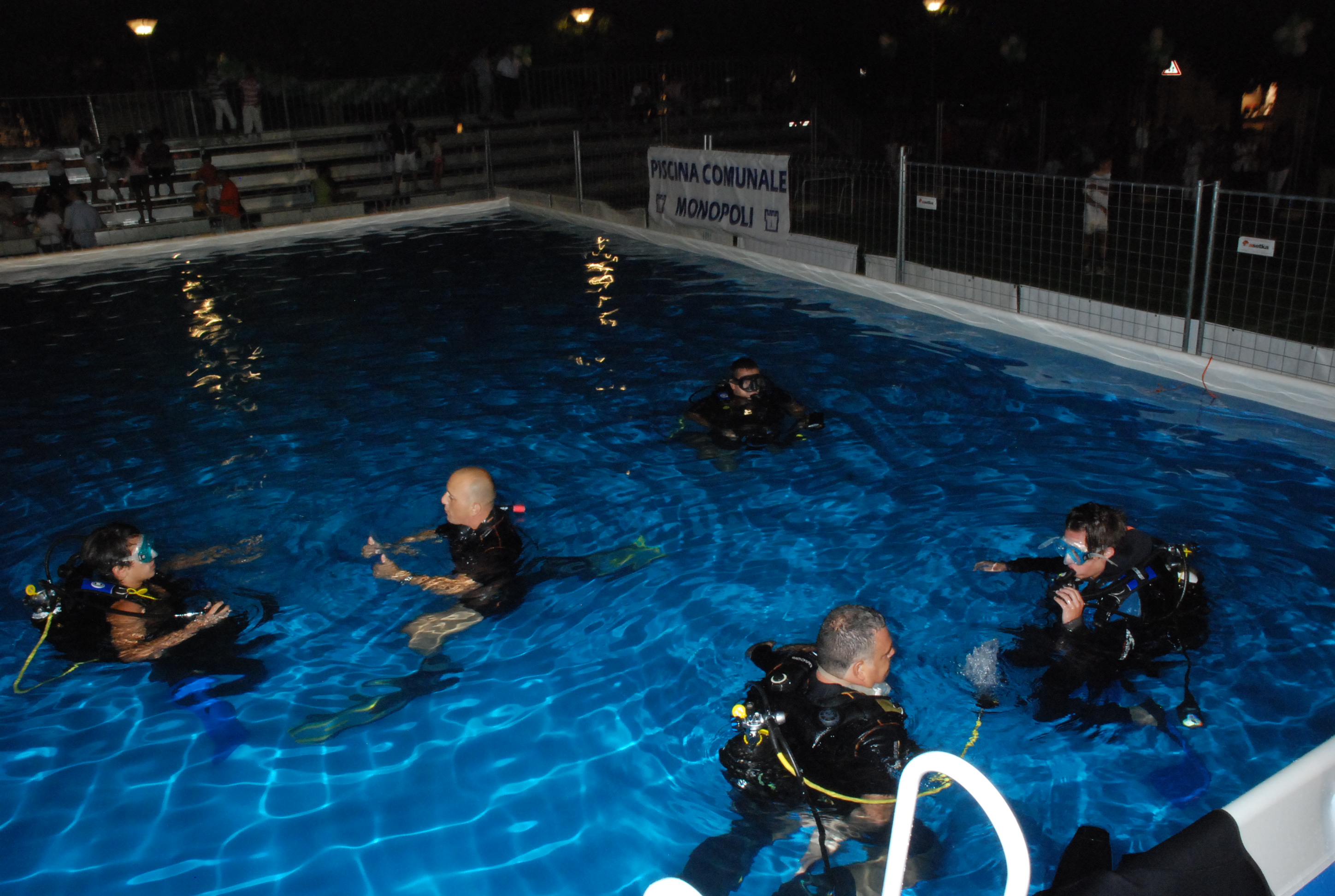 Nel nostro specifico caso, in collaborazione con la Piscna Comunale di Monopoli e a.s.d. Mediterranea Nuoto, venne allestita una piscina per poter provare, anche se a minima pofondità, la sensazione di respirare sott'acqua.