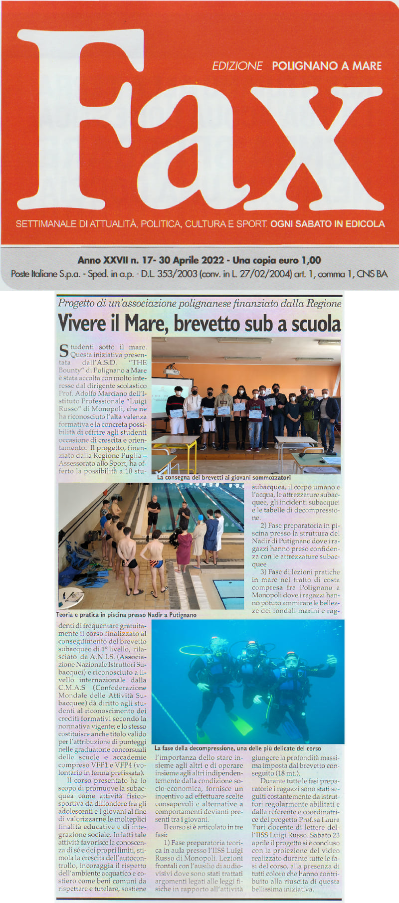 Il progetto ha promosso l'attività subacquea come attività sportiva capace di favorire l'integrazione sociale, la conoscenza di sè e dei propri limiti, ha stimolato la crescita dell'autocontrollo e incoraggiato la conoscenza e il rispetto del mondo acquatico come bene comuna da tutelare.